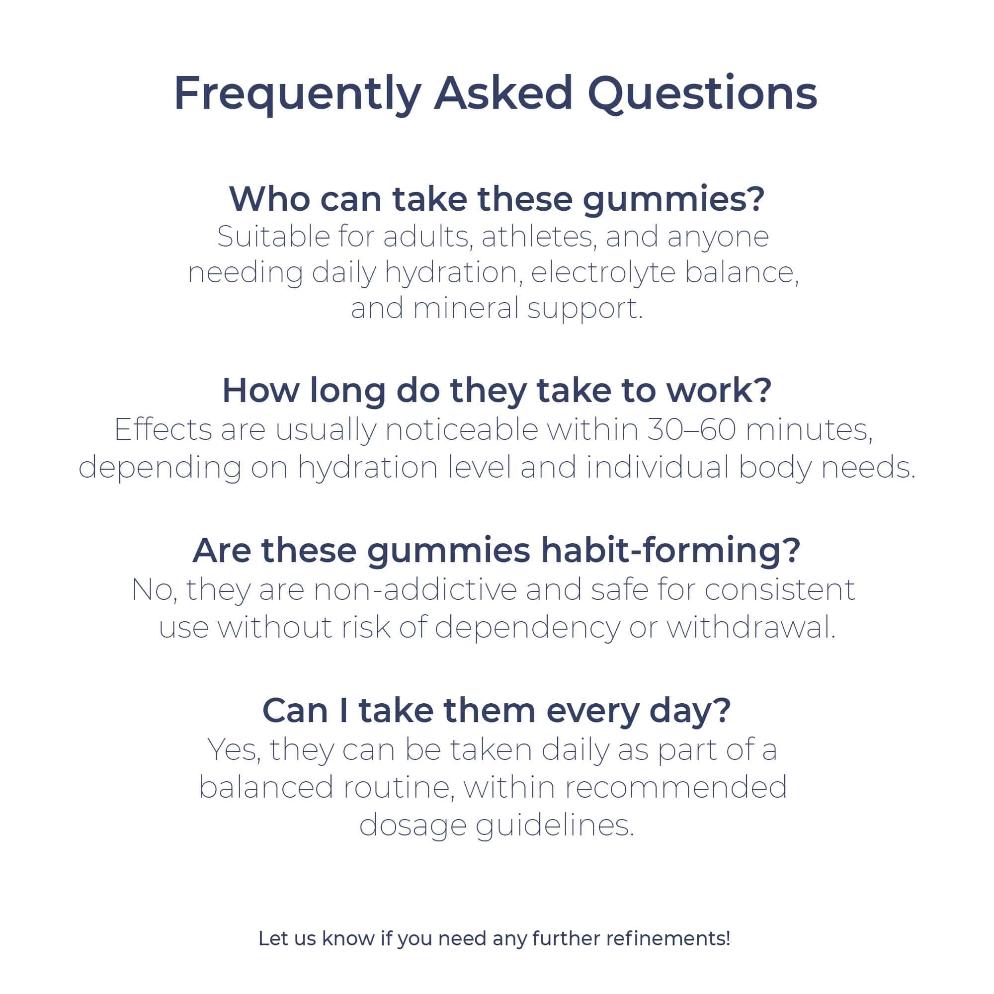 Electrolyte Gummies offer a delicious and convenient way to support daily hydration and mineral balance. With carefully chosen ingredients like potassium, sodium, magnesium, calcium, and vitamin D3, they provide an easy alternative to powders, tablets, or drinks—no mixing or swallowing large pills required. Designed for on-the-go lifestyles, they fit seamlessly into your daily routine, making them perfect for busy days, workouts, or travel. Plus, with their refreshing fruity taste, taking your supplement feels more like a treat than a chore. Whether at work, the gym, or outdoors, these gummies make it simple to stay on track while enjoying great flavor. A tasty boost for everyday balance!