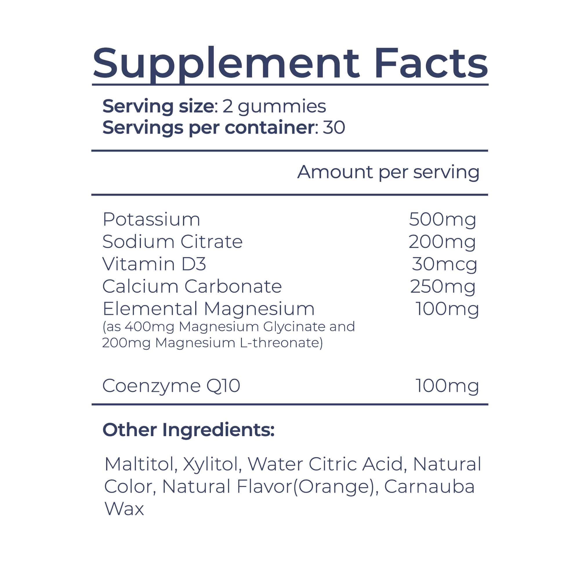 Main Ingredients: Potassium, Sodium Citrate, Vitamin D3, Calcium Carbonate, Elemental Magnesium(as 400mg Magnesium Glycinate and 200mg Magnesium L-threonate), Coenzyme Q10