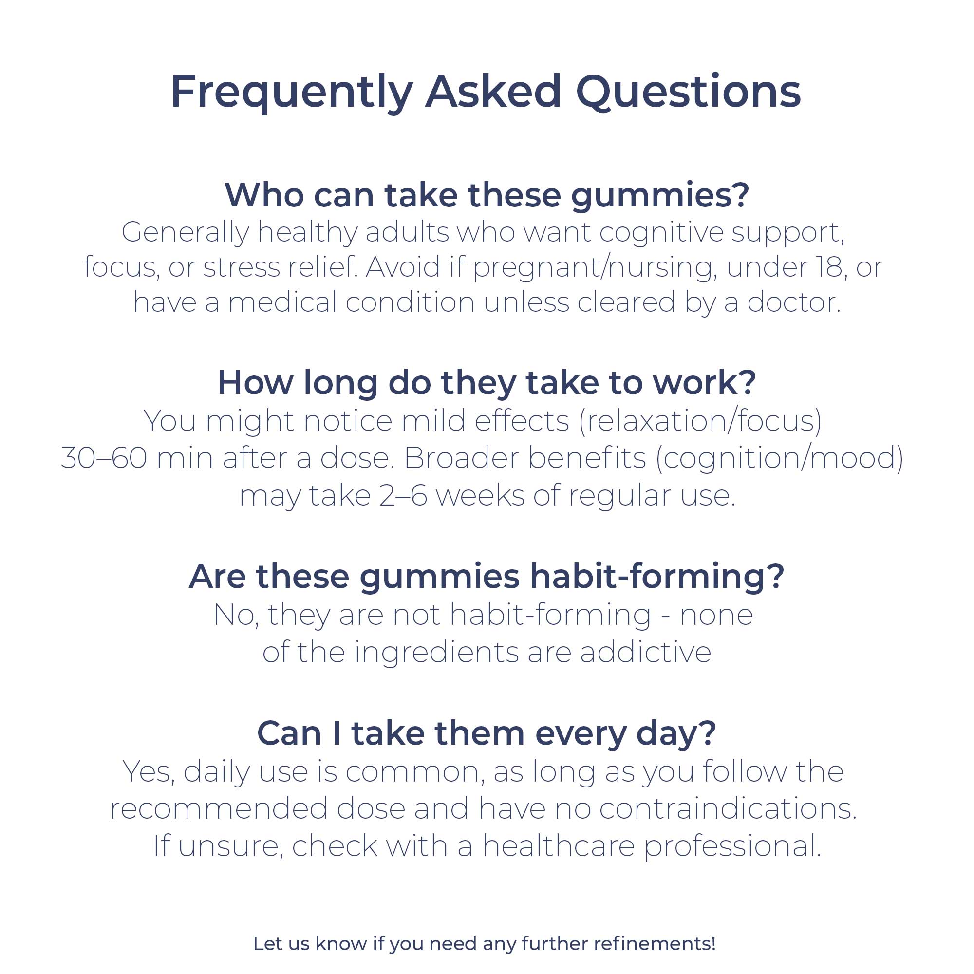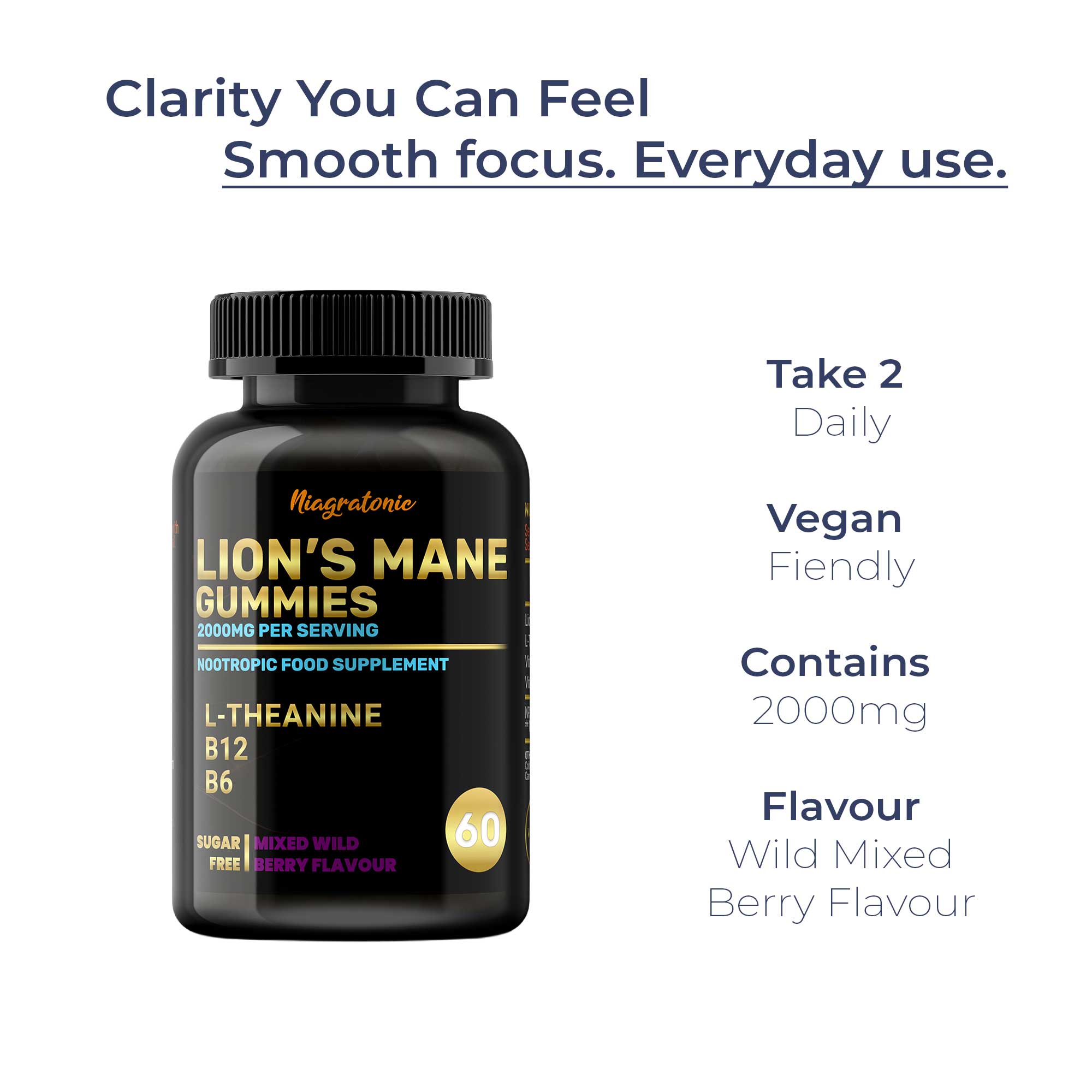 Formulated with Lion’s Mane mushroom, L-theanine, and essential vitamins B6 & B12, these gummies are designed to support focus, mental clarity, and calm energy – without jitters or crashes. Perfect for busy days, creative work, or anytime your brain needs extra support. Made for daily use, these gummies fit seamlessly into your routine while tasting like a treat, not a supplement.Main Ingredients: Lion’s Mane, L-Theanine, Vitamin B6, Vitamin B12